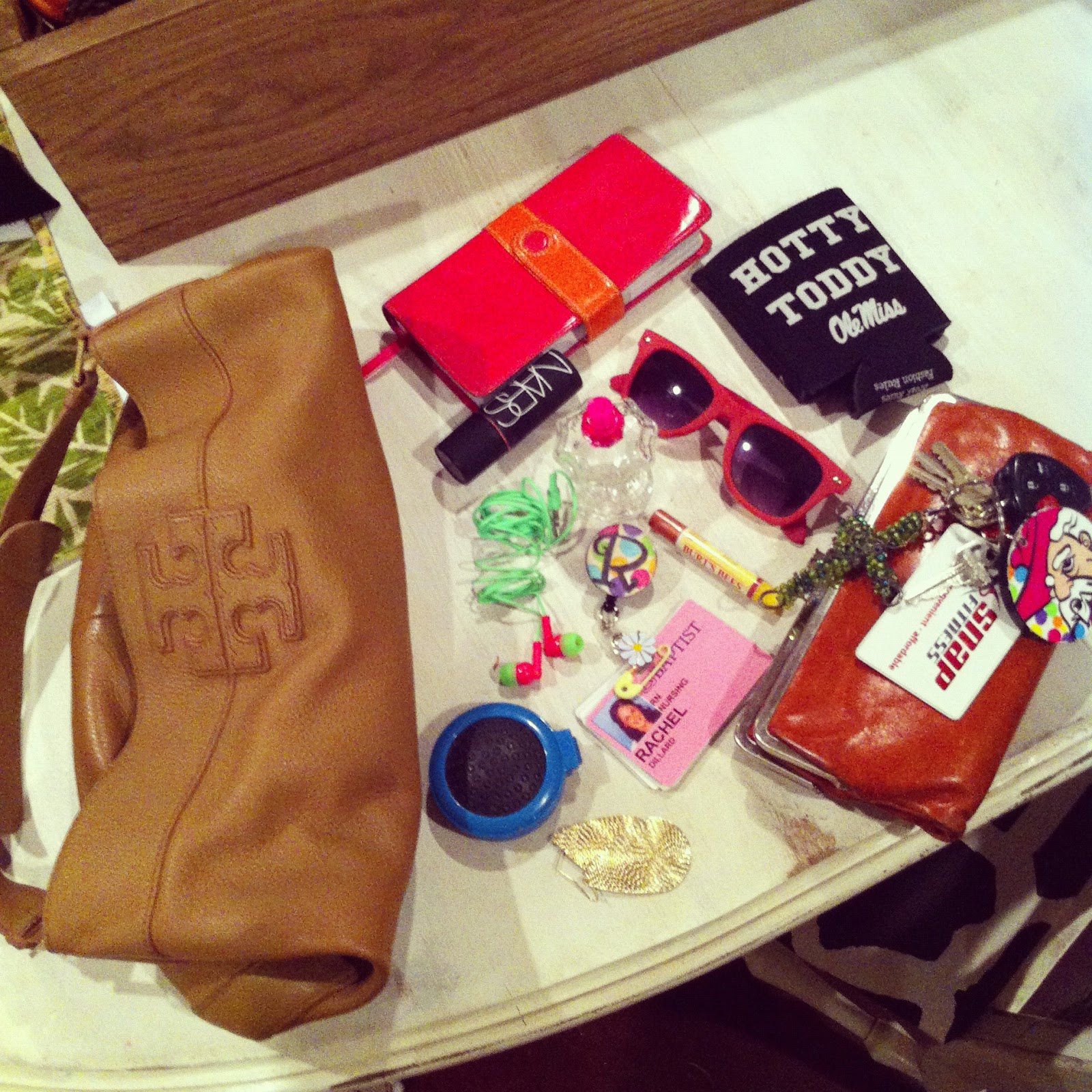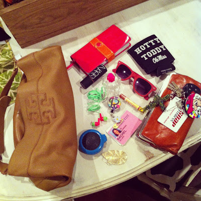 My purse is pretty boring--all of the typical things...wallet, keys, lip gloss. My earbuds, some earrings, mini brush to tame the fro...Nars blush stick, sunglasses, perfume. My hospital badge, my Bible, and the ever-present huggie because it always comes in handy! Oh, and there was totally a pack of M&Ms in there, but I ate those just now :)